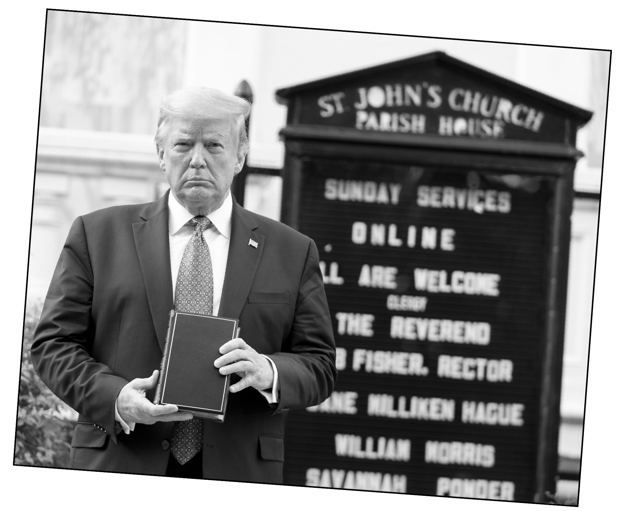 Donald Trump showing his famous zeal, using tear gas and riot police to have his photo taken at his church in D.C.; every U.S. president in history has attended Saint John’s on 16th Street since it was built in 1816