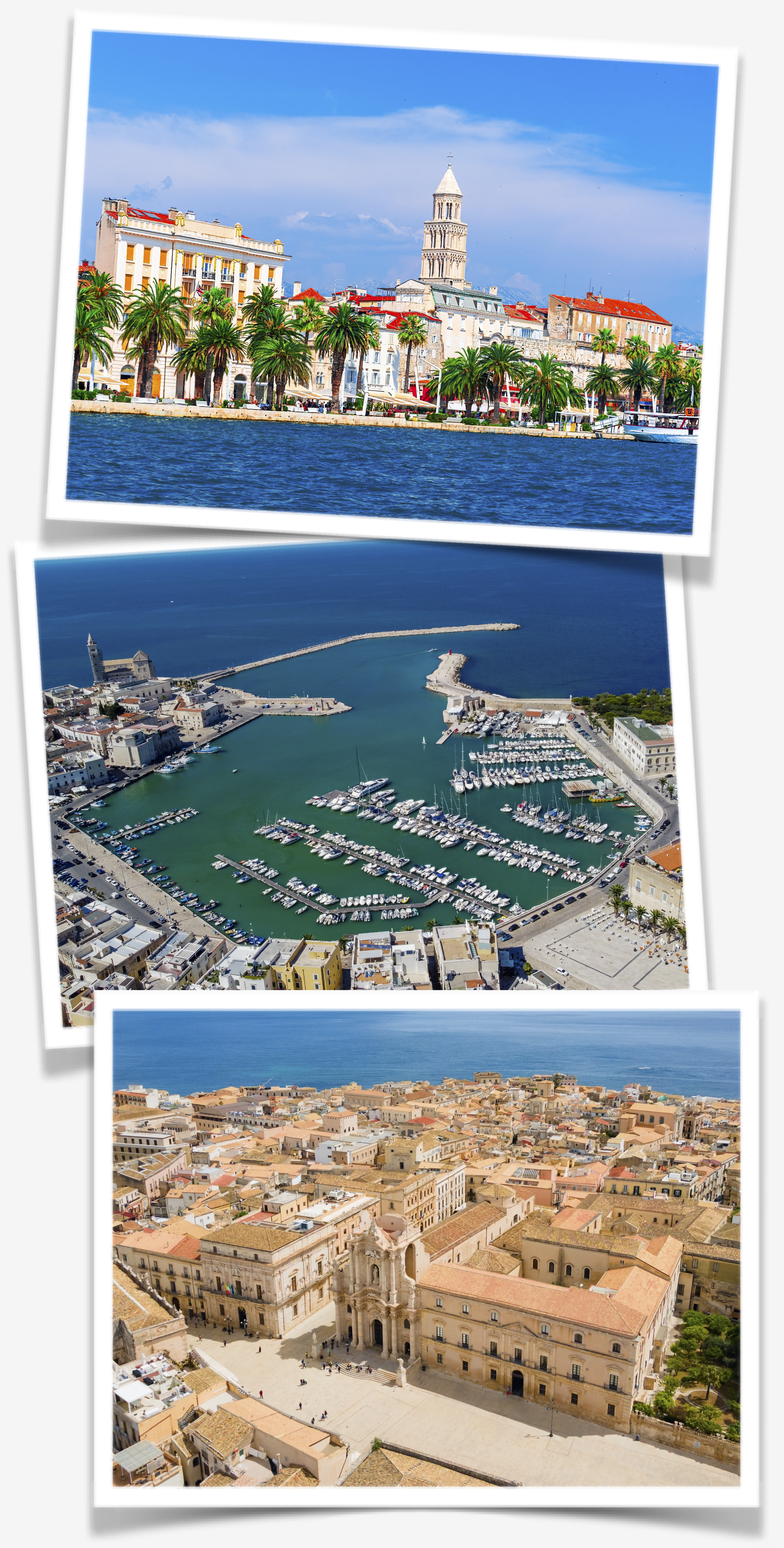 Saint Domnius in Croatia, the world’s oldest Catholic cathedral, the harbour and cathedral at Trani, with its ancient bronze doors, and Syracuse in Sicily, built on the battered columns of a Greek temple